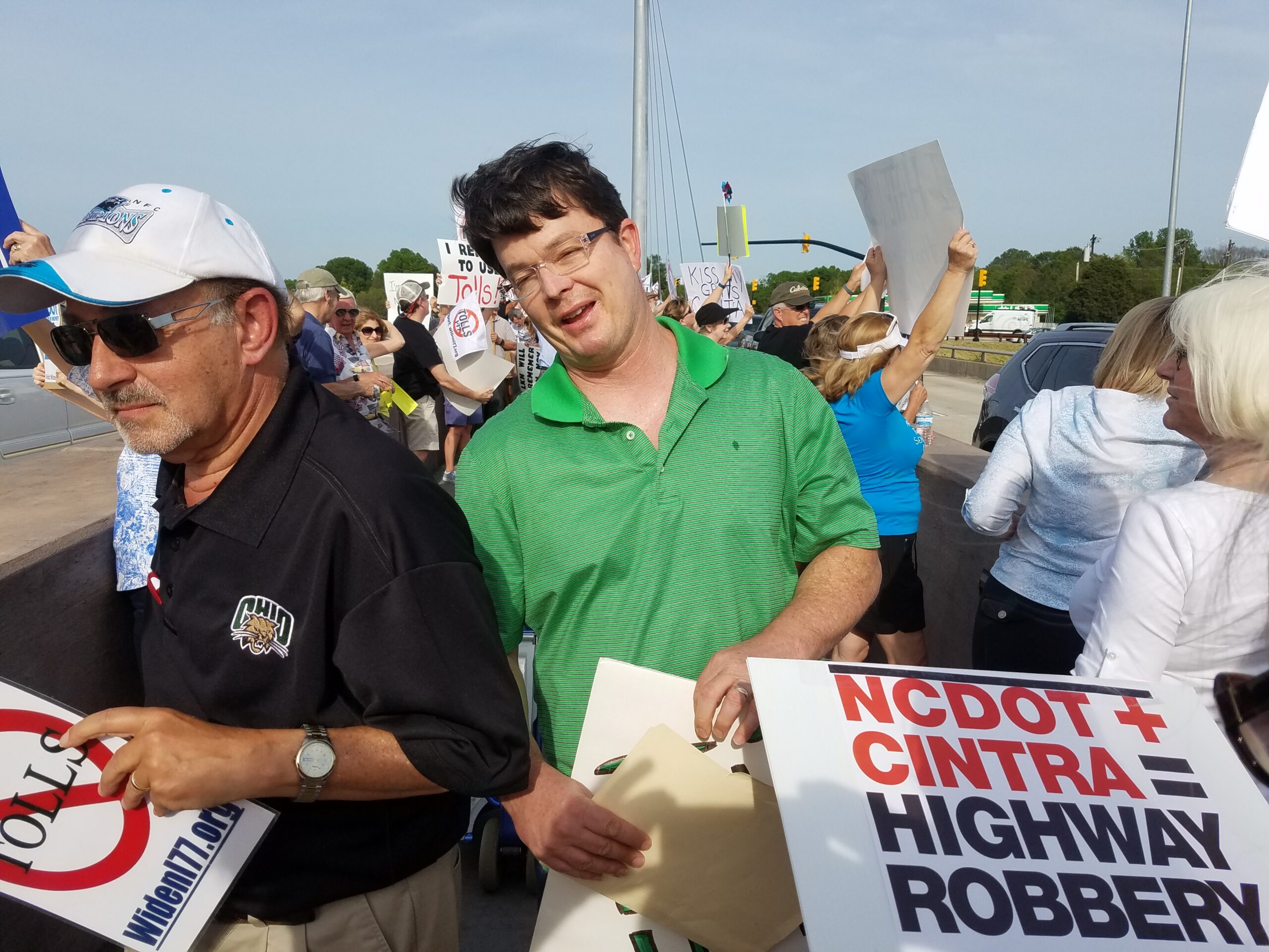 Meanwhile, anti-toll forces gathered on the I-77 bridge at Exit 28 in Cornelius for a full-scale demonstration at rush hour this afternoon. One-hundred-fifty to 200 protesters waved signs on the bridge at 5:45 p.m., a solid visual for evening TV news.
