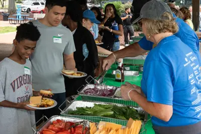 At lunchtime, everyone gathers at the Duke Energy Explorium for a large picnic staffed by 75 volunteers.