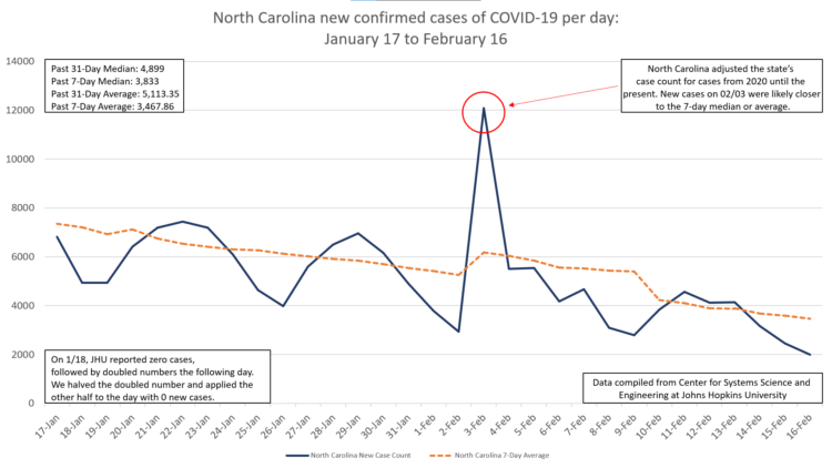 Feb. 17. With President Biden suggesting things won’t get back to normal until around Christmas, the rate of new coronavirus cases during the past week was 21.7 percent lower than the preceding 31 days. (See chart, based on Johns Hopkins data.) The NC Dept. of Health & Human Services is reporting 3,167 new cases today, with statewide hospitalizations at 1,954.