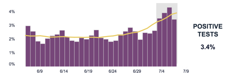 July 8. The NC Dept. of Health & Human Services Thursday reported 630 new COVID-19 cases statewide, the largest daily increase since late May. Positive testing, which climbed to 4.8 percent yesterday, fell to 3.4 percent today. On July 1 it was 2 percent.