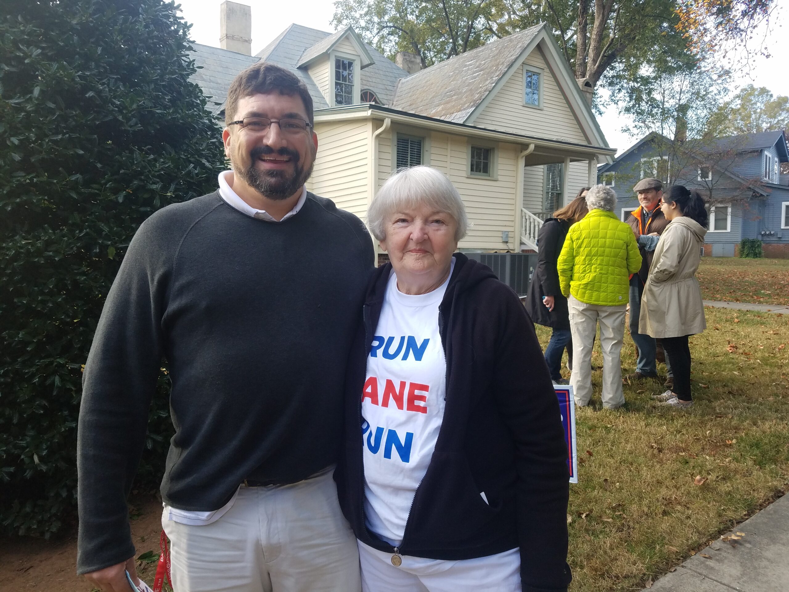 - Ann Bradford with her son John Bradford meet voters at Cornelius Town Hall