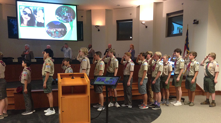 Members of Boy Scout Troop 72 led the Pledge of Allegiance at the Cornelius Town Board Meeting on Monday night. The troop meets Tuesdays at 7 pm at Bethel Presbyterian Church. More info: http://troop72cornelius.com/