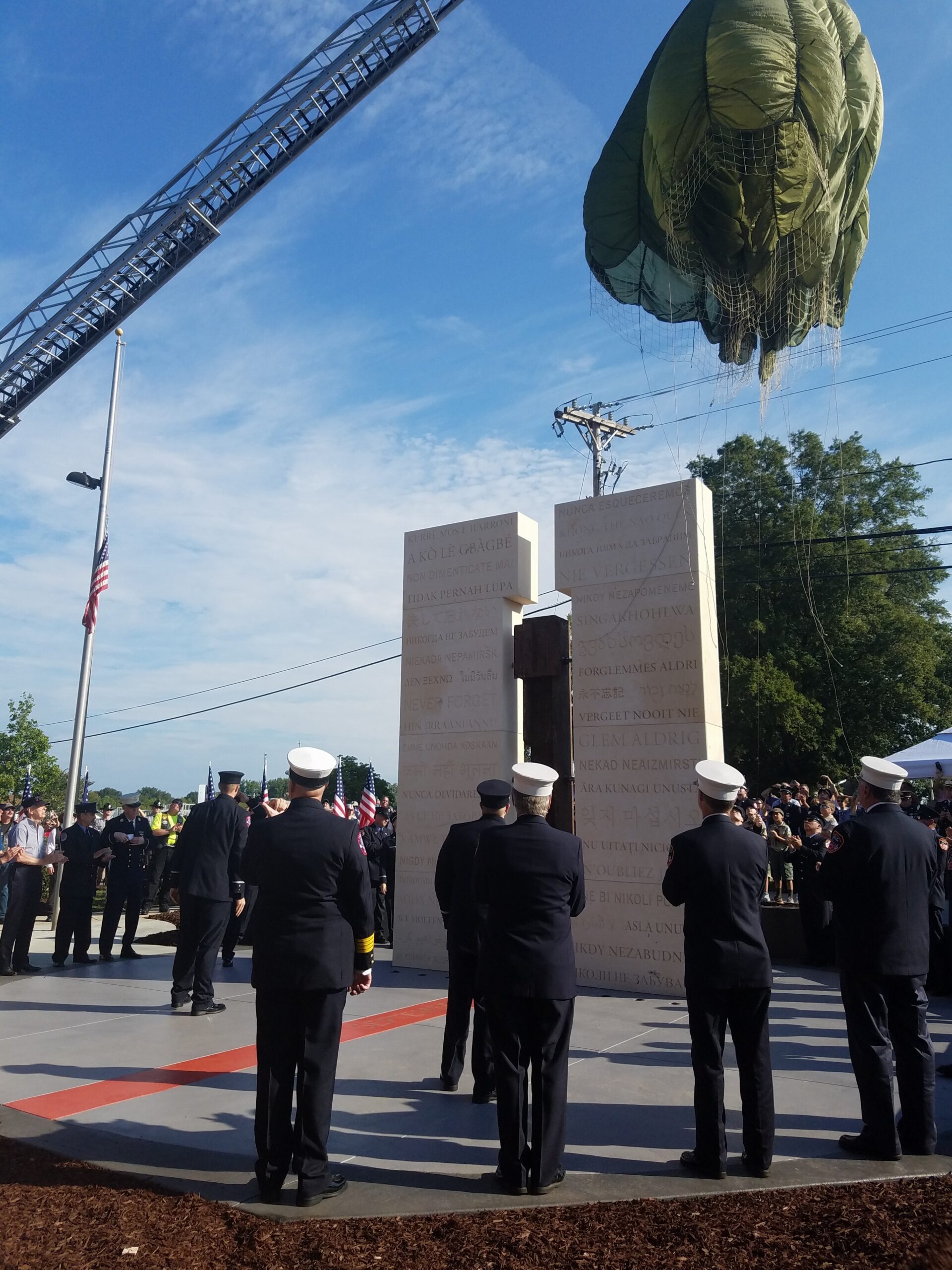 Sept. 11. One of the most important events in American history is forever commemorated in front of Fire Station No. 1 in Cornelius. A 2-hour ceremony drew 1,000 people, including firefighters from New York as well as Cornelius, police, military, ordinary citizens and elected officials ranging from Cornelius commissioners to U.S. Sen. Thom Tillis. The new monument, called “Never Forget,” faces northeast, on a line that passes through Washington D.C. and New York City. Speakers included Steve Giordano, who was working in the Twin Towers, Fire Chief Neal Smith, Police Chief Bence Hoyle, Cornelius Mayor Chuck Travis, NC Sen. Jeff Tarte, NC Rep. John Bradford and US Sen. Thom Tillis.