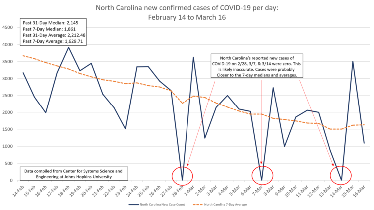 March 17. By Dave Yochum. The median of new coronavirus cases over the past seven days (1,861) in North Carolina is running 13.2 percent below the median during the past 31 days (2,145), based on COVID-19 data supplied by Johns Hopkins University.