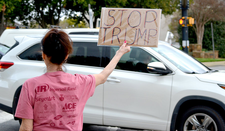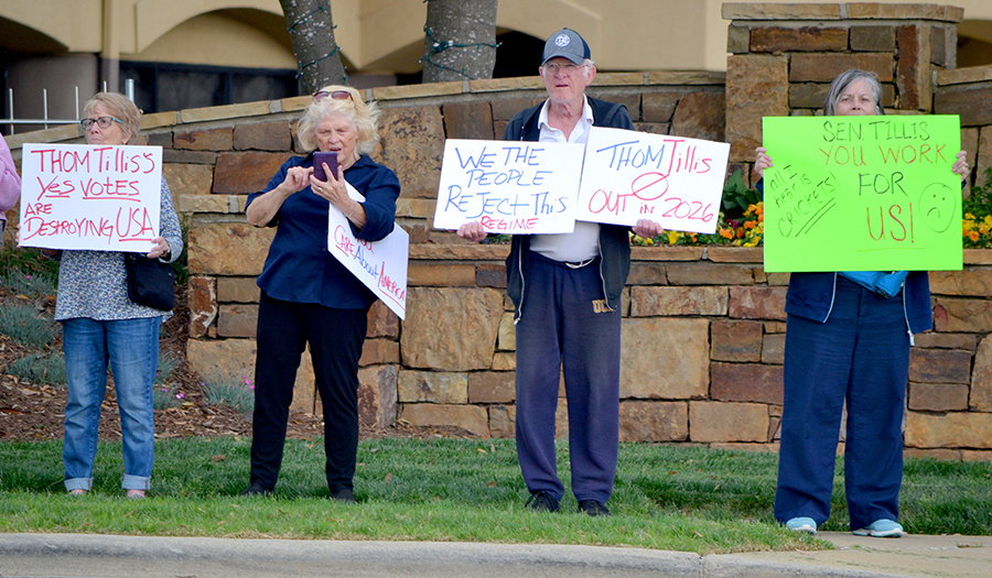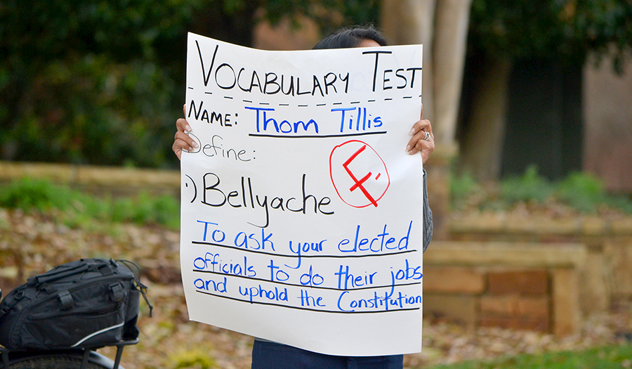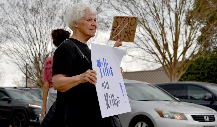 Protestors are “demanding representation” and question the “lack of Town Halls” by Tillis according to protestors Joan Adams and Karen Asche.