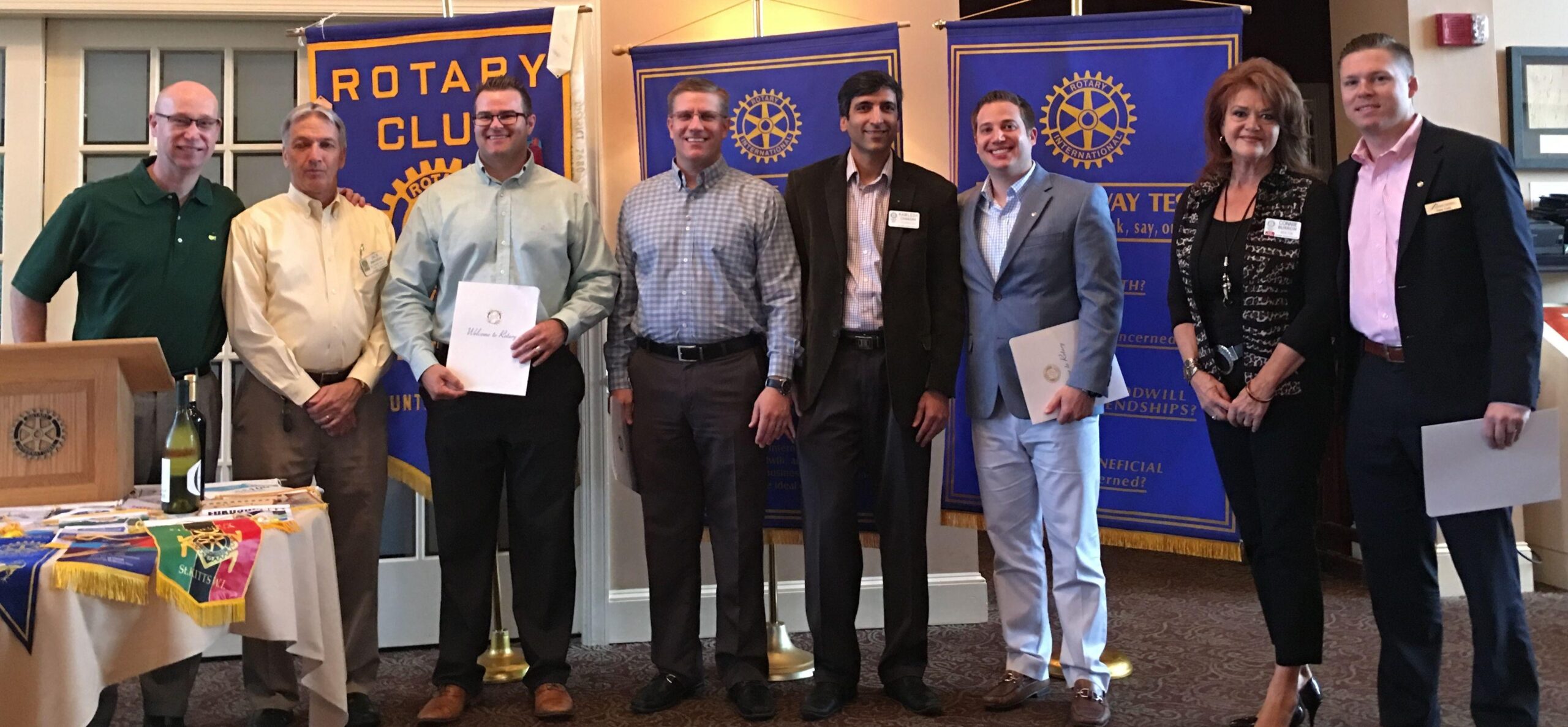 Club President Charlie Curtis; member Jack Simoneau, who sponsored new member Mike Hege; Brett Alkins and his sponsor Kamlesh Chandan; Matthew Gidaly; and Connie Burrow, sponsor of Andrew Cody. COURTESY OF ANTHONY CIRILLO