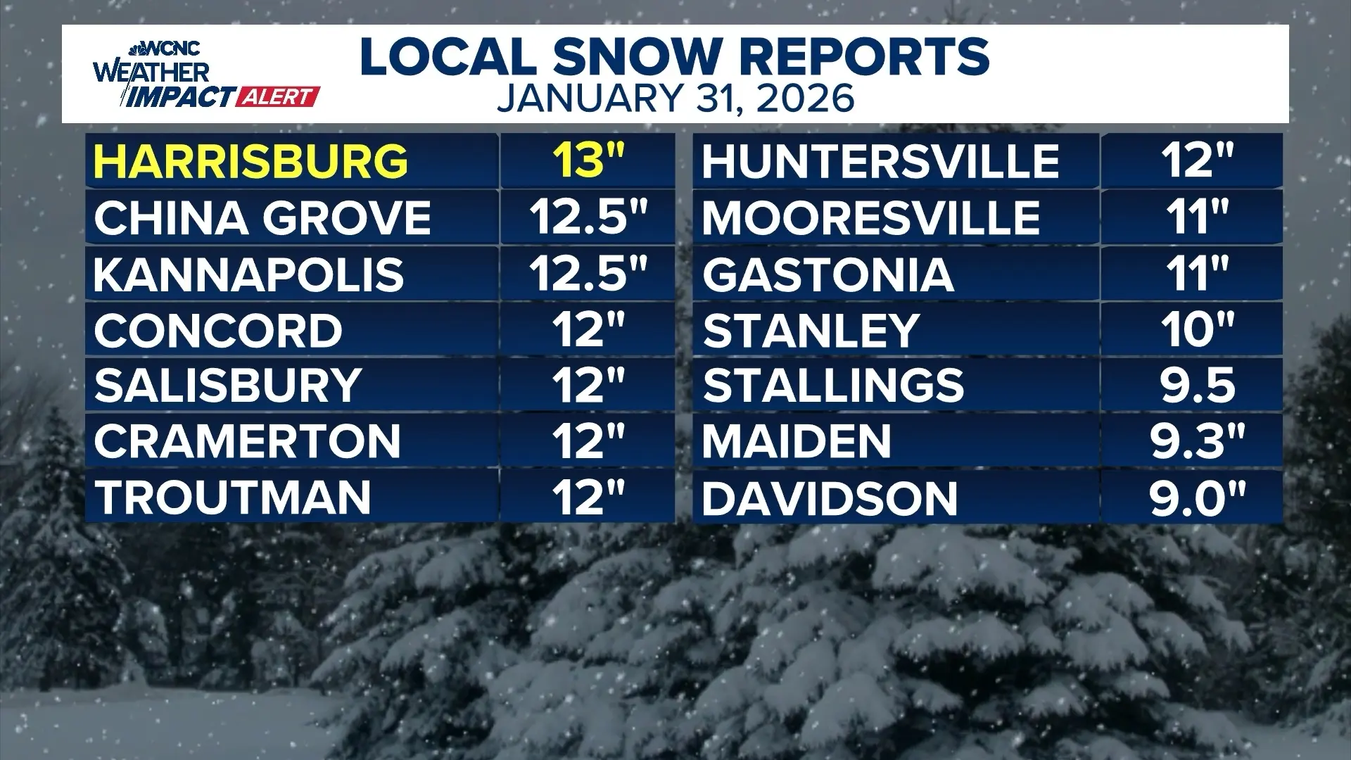 9:51 a.m. – WCNC’s graphic this morning shows snowfall totals in surrounding towns. Cornelius isn’t listed but from what we’ve seen on socials we fluctuated between nine and 12 inches.
