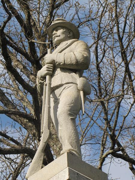 A Confederate Common Soldier statue stands on top of a tall tapered column.