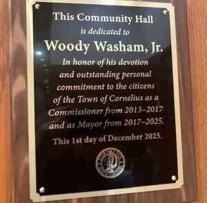 Dec. 2. By Dave Vieser. With the swearing-in of newly elected town officials, Monday evening’s Town Board meeting was the last for Cornelius Mayor Woody Washam, who served four terms as mayor and three terms as a town commissioner.